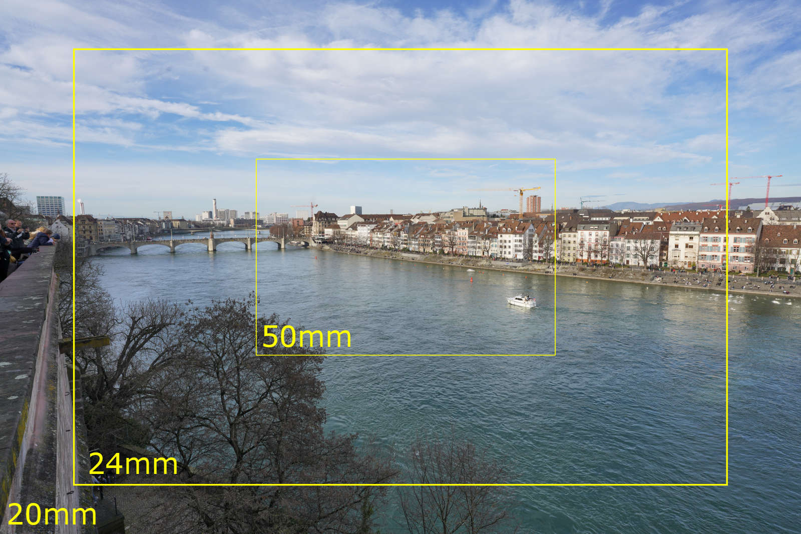 Die bekannte Ansicht von der Basler Pfalz zur Mittleren Brücke verdeutlicht die Wirkung des grossen Bildwinkels. Es kommt gegenüber dem 24mm Weitwinkel nochmals beträchtlich mehr aufs Bild
