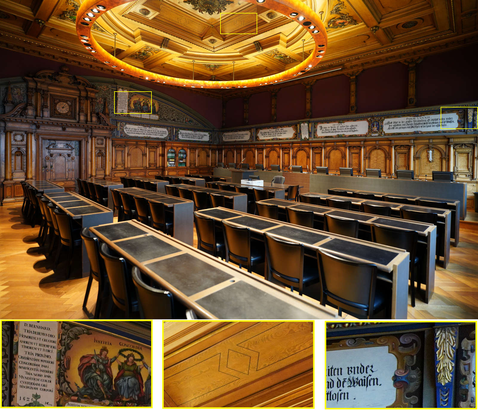 Der Kantonsratssaal in Schaffhausen ist ein architektonisches Prunkstück mit fantastischen Holzarbeiten aus dem 18. Jahrhundert. Hier kommt der Raum mit den 94 Grad Bildwinkel voll zur Geltung
