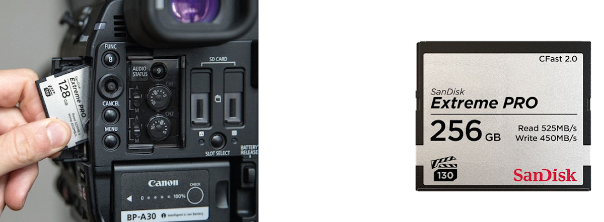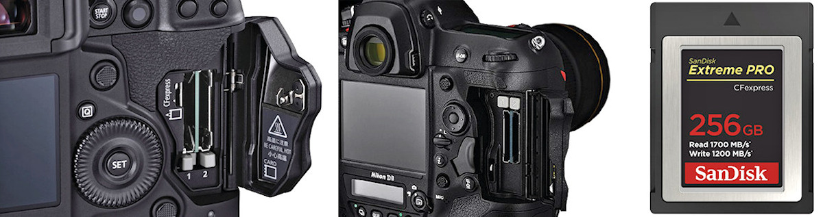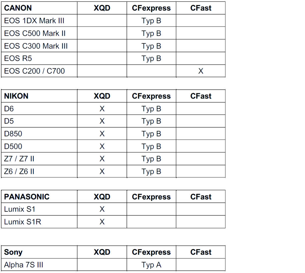 Kameramodelle im Top-End Bereich von Canon, Nikon und Panasonic, verwenden als Datenspeicher modellabhängig sogenannte CFast-, CFexpress- oder XQD-Karten, als Nachfolger der CF-Karten.