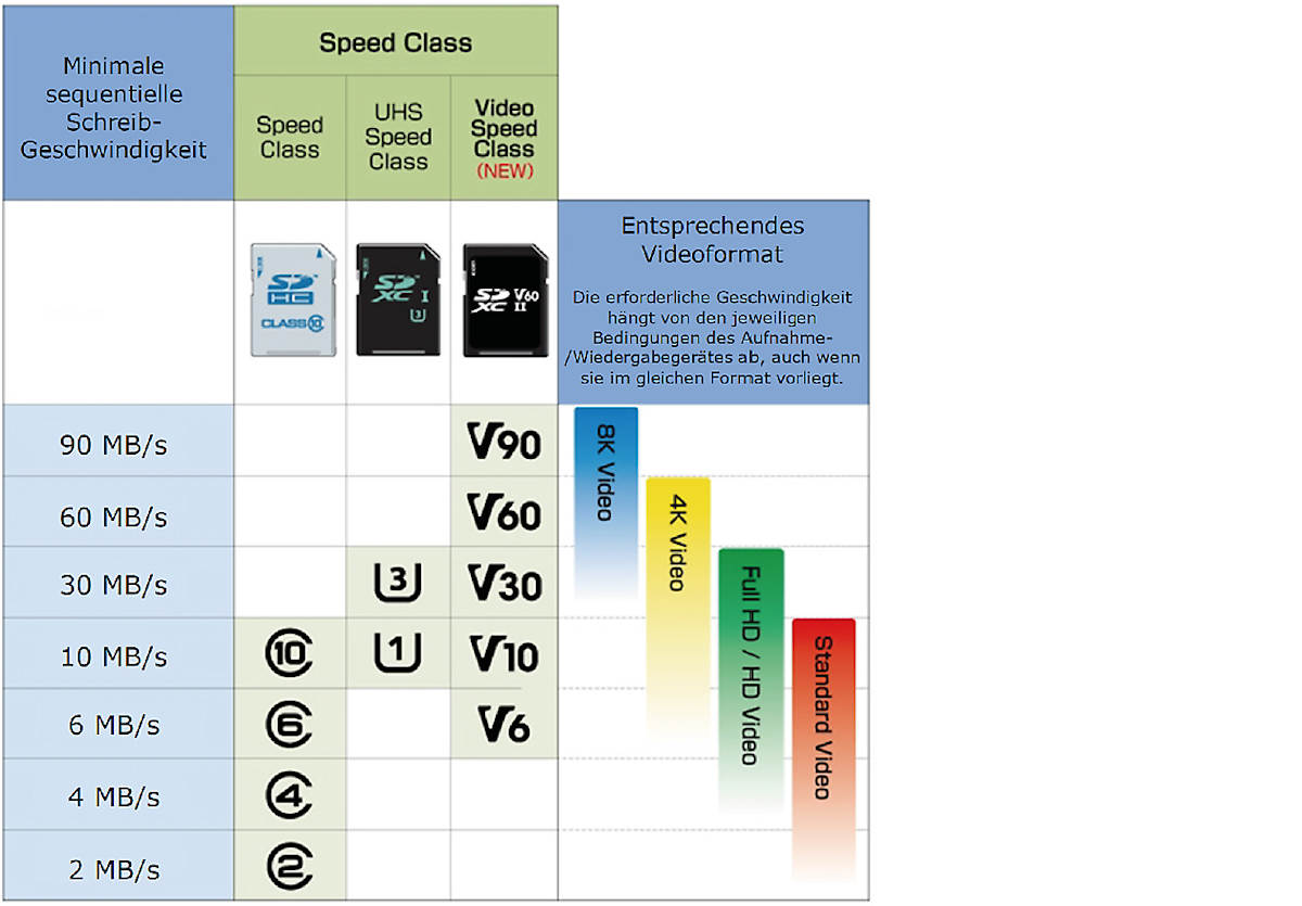 Für Videofilmer ist daher neben der Speicherkapazität, die Angabe zur Videogeschwindigkeit von grosser Bedeutung. Heute wird diese mit V10, V30, V60 oder V90 angegeben und bedeutet, dass z.B. bei V30 eine Karte eine ununterbrochene, kontinuierliche Schreibgeschwindigkeit von mindestens 30MB/s leisten muss.