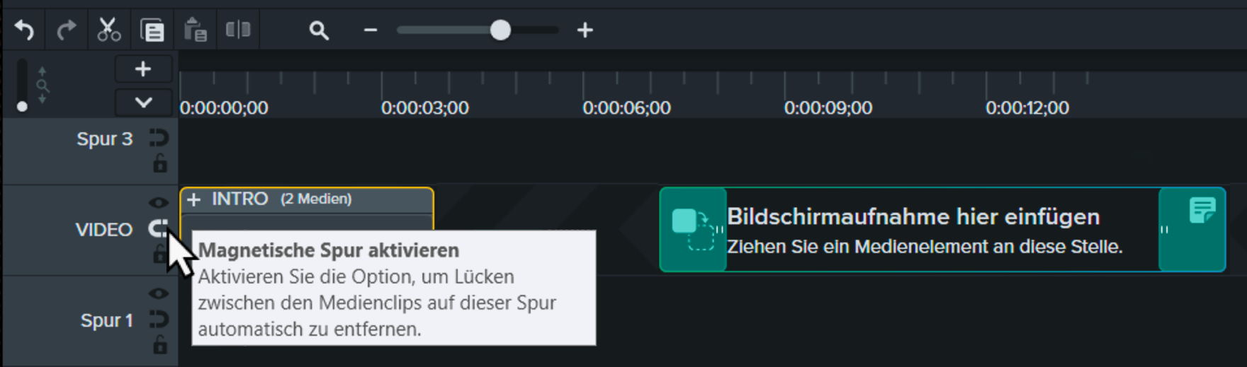 Magnetische Spuren: Durch Aktivieren der Funktion «Magnetische Spur» werden die einzelnen Clips auf einer Spur automatisch zusammengerückt, um Lücken in der Zeitachse zu schliessen und ein durchgehendes Video zu erstellen. Dank dieser Funktionalität lassen sich einzelne Sequenzen und Videoclips innerhalb der Spur leichter verschieben oder austauschen.