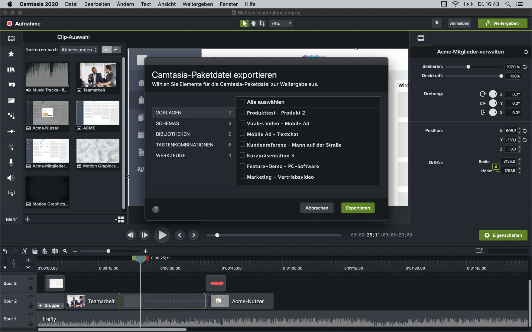 Pakete exportieren: Für die Arbeit in Teams kann Camtasia Vorlagen-Pakete erstellen und exportieren. Die Funktion richtet sich vor allem an leitende Anwender, die damit bestimmte Vorlagen mit Favoritensammlung, Bibliotheken, individuellen Farbschemas und anderen Voreinstellungen in einer einzigen Datei zusammenfassen (.campackage) wollen.