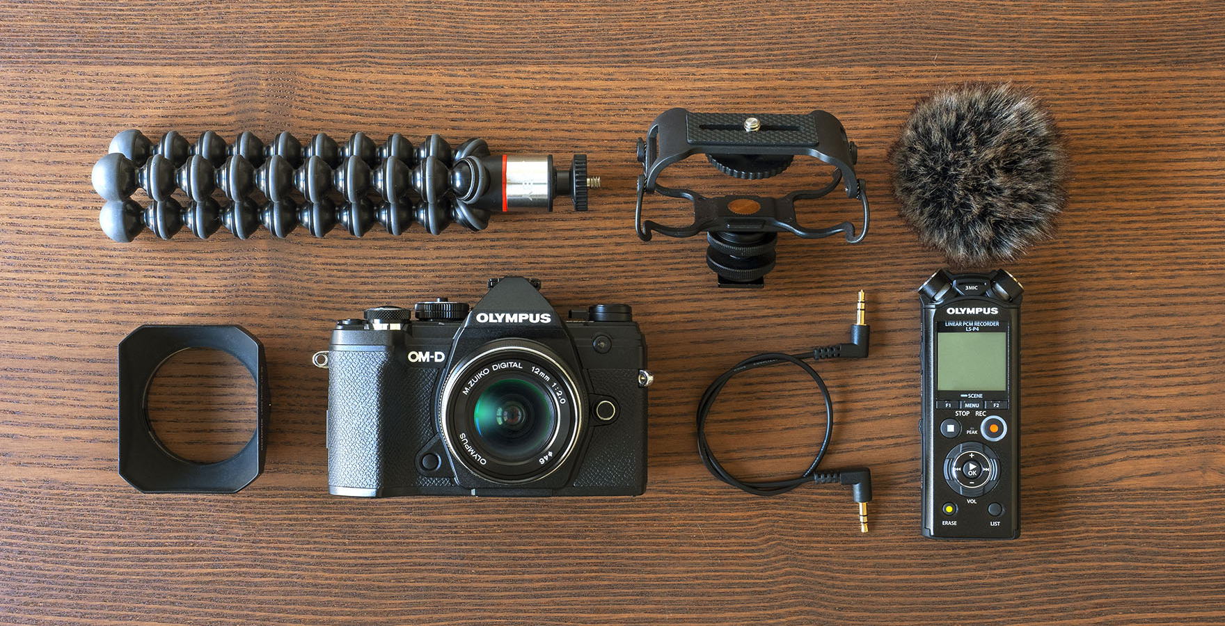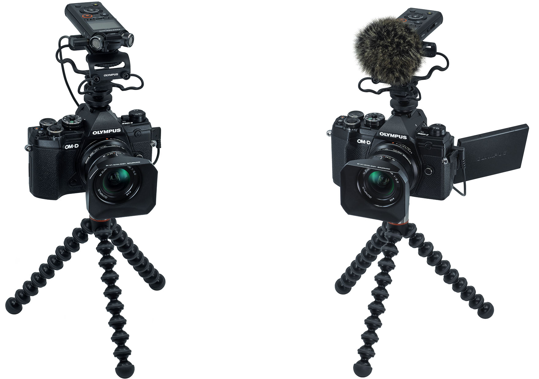 Olympus OM-D E-M5 Mark III mit dem Audiorekorder Olympus LS-P4 und einem flexiblen Tischstativ Joby GorillaPod, dessen biegsame Beine sich zur auch um Objekte wie einen Ast u.ä. wickeln lassen.