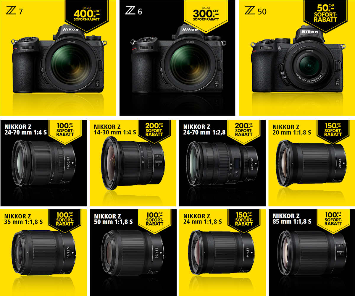 In den «Nikon Z Wochen» gibt es die drei Nikon Z-Modelle Z6, Z7, und Z50, mit diversen Kits und acht Wechselobjektiven der Z-Reihe vom 17. Juni bis 17. Juli 2020 mit bis zu 400 Franken Sofortrabatt. Es können pro Kunde maximal zwei Kameras und drei Objektive gekauft werden. Der Rabatt wird ausschliesslich von teilnehmenden Händlern und direkt beim Kauf eines aktionsberechtigten Produktes verrechnet.
