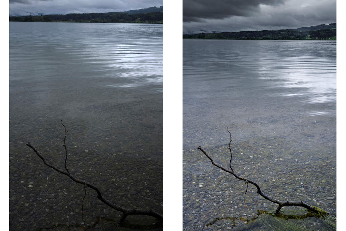 Der neutrale Verlaufsfilter schafft einen Ausgleich von Himmel und Erde. Ohne Verlaufsfilter (Bildhälfte links) wird entweder Himmel zu hell oder die Erde zu dunkel. Mit Verlaufsfilter 0,8 wird das Bild ausgewogener. Als Regel gilt: dunkle Partien lassen sich nachträglich besser bearbeiten.
