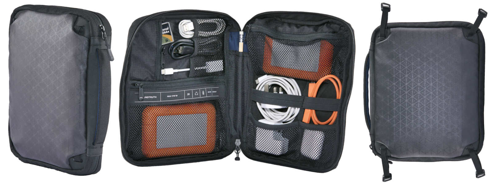Die praktische RIKR Tech Pouch bietet einen sicheren und leicht zugänglichen Platz für Kabel, Peripherie-Hilfsmittel, wie Kartenlesegeräte, Ladegeräte Reiseutensilien oder Kleinzubehör. Sie verfügt über eine Reissverschlussöffnung aus YKK Natulon und eine wasserabweisende PET-Aussenhülle. Das Innere ist mit drei Reissverschlusstaschen, fünf kleinen Netztaschen unterteilt. Ein elastischer Innenriemen fixiert die Gegenstände an ihrem Platz. Die Tech Pouch lässt sich leicht an der Innenseite des RIKR-Rucksacks mit Hilfe von dafür vorgesehenen Riemen befestigen, die bei Nichtgebrauch bequem versteckt werden können. Eine Groundtruth Tech Pouch schont mit 20 Plastikflaschen die Umwelt.