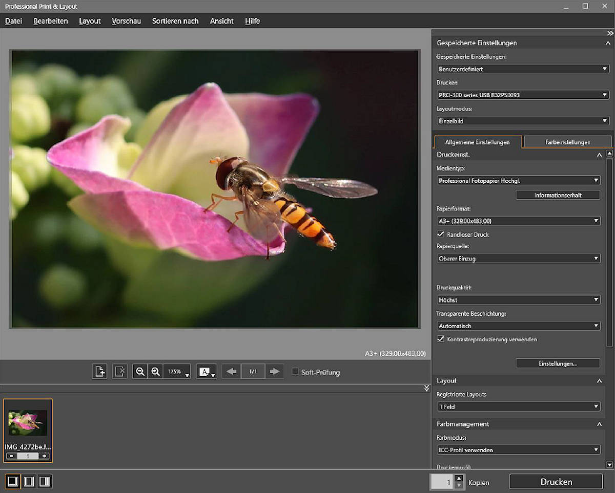 Die Canon Professional Print & Layout Software ist im Lieferumfang des imagePROGRAF PRO-300 enthalten. Die Software kann eigenständig oder als Plugin für Adobe Photoshop und Lightroom eingesetzt werden. Der Anwender steuert damit das Farbmanagement, die Profilauswahl und die Layouteinstellungen wie z.B. Galerie-Wrap-Druck und Panoramadruck. Die Software ermöglicht präzise Farbabstimmung vom Bildschirm bis zum Druck und bietet die erforderlichen Soft-Proofing- und Hard-Proofing-Funktionen.
