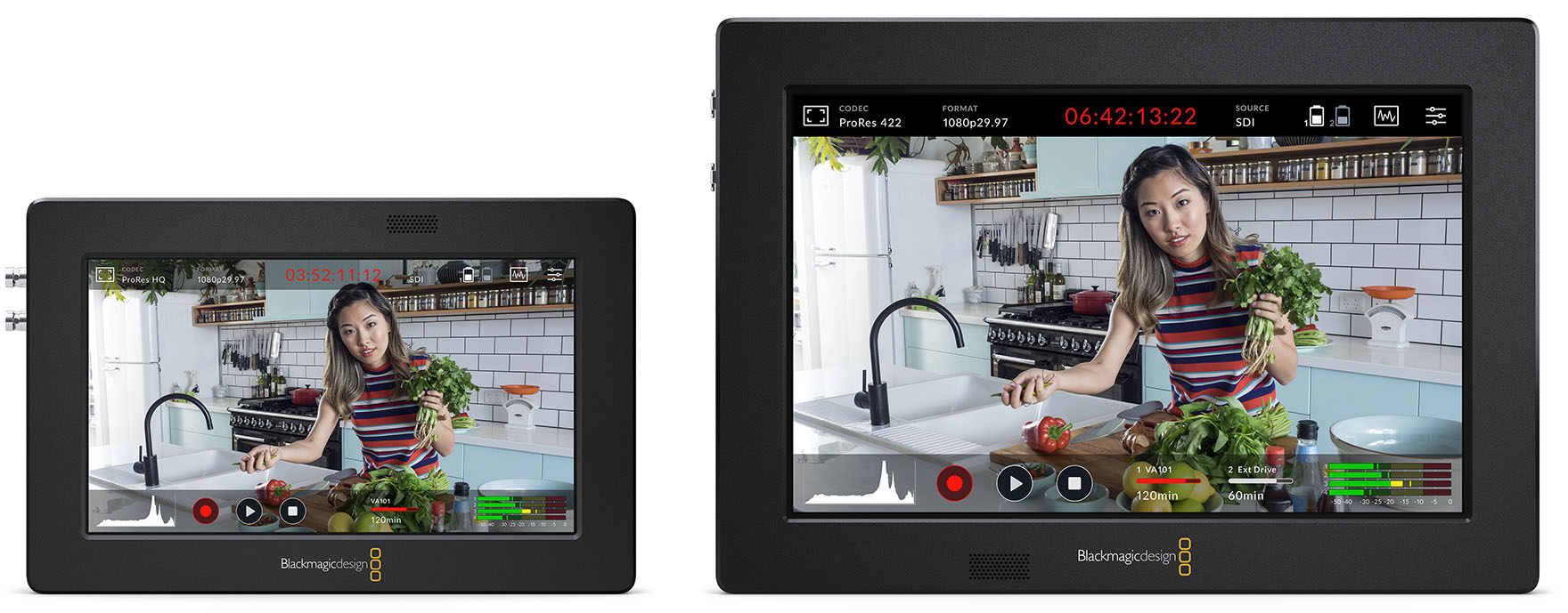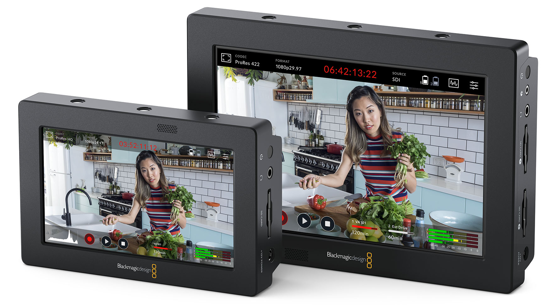 Blackmagic Design bringt den Blackmagic Video Assist 3G 5″ (links) und den Video Assist 3G 7″. Diese erschwinglichen Modelle erweitern jede Kamera um Aufzeichnung in höherer Qualität und ein Grossdisplay fürs Monitoring samt Scopes und Fokussierhilfen.