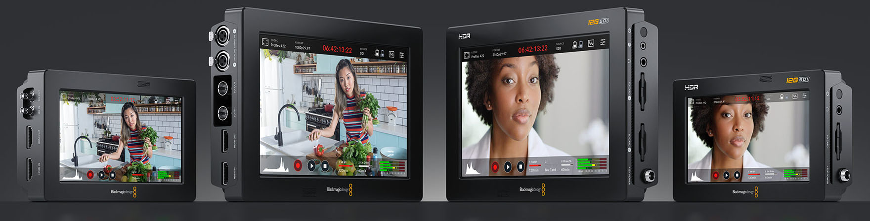 Die neuen günstigeren «Video Assist 3G»-Modelle in der linken Bildhälfte und die «Video Assist 12G HDR»-Modelle in der rechten gibt es jeweils als kleinere 5 Zöller mit einem SD-Steckplatz und als grössere 7 Zöller mit zwei Steckplätzen und XLR-Mikrofon-Anschlüssen.