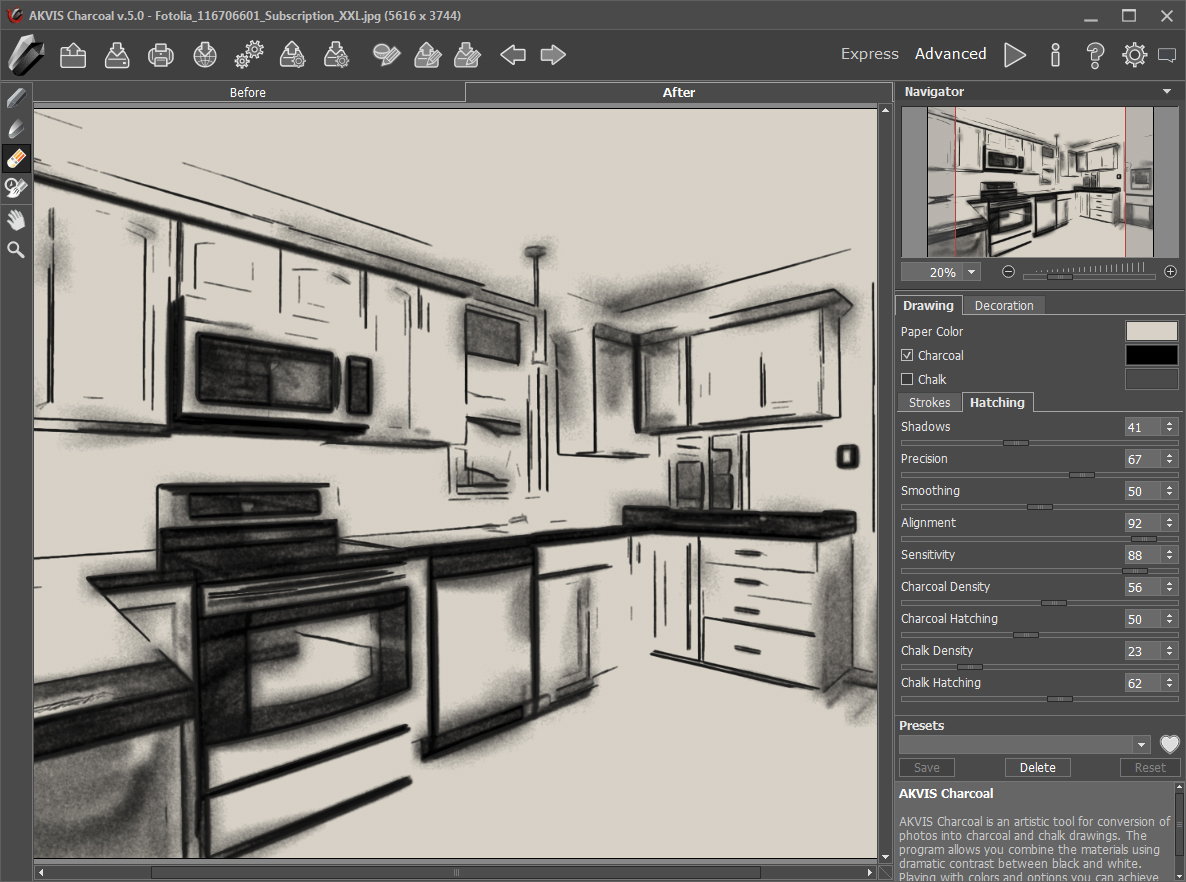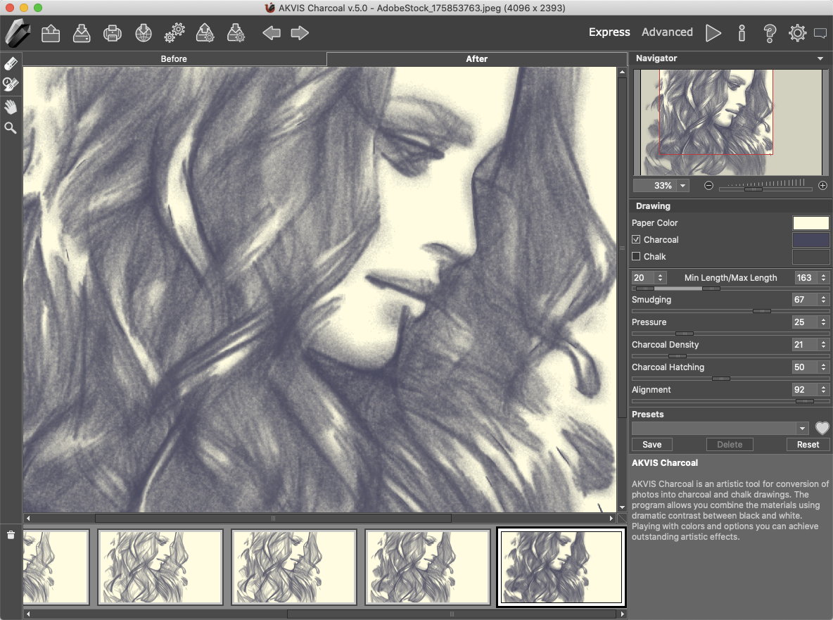Die Version 5.0 von Charcoal bietet einen komplett überarbeiteten Bearbeitungsalgorithmus, der natürlichere Schraffurlinien und Schattierungen erzeugt. Die Schnellvorschau ist wesentlich präziser geworden. Ausserdem liefert das Update andere Verbesserungen, die das Programm benutzerfreundlicher und effektiver machen. Die mit der neuen Version produzierten «Zeichnungen» sehen so realistisch aus, als ob sie von der Hand eines Künstlers erstellt worden wären. Das Programm verwischt sanft die homogene Bereiche und mischt die Striche, wodurch die Zeichnung mehr Tiefe erhält und lebhafter wirkt.