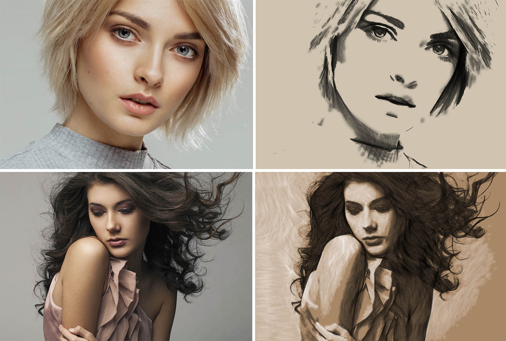 Beispiele für die Umwandlung mittels Akvis Charcoal: vorher und nachher bzw. Fotos und Zeichnung
