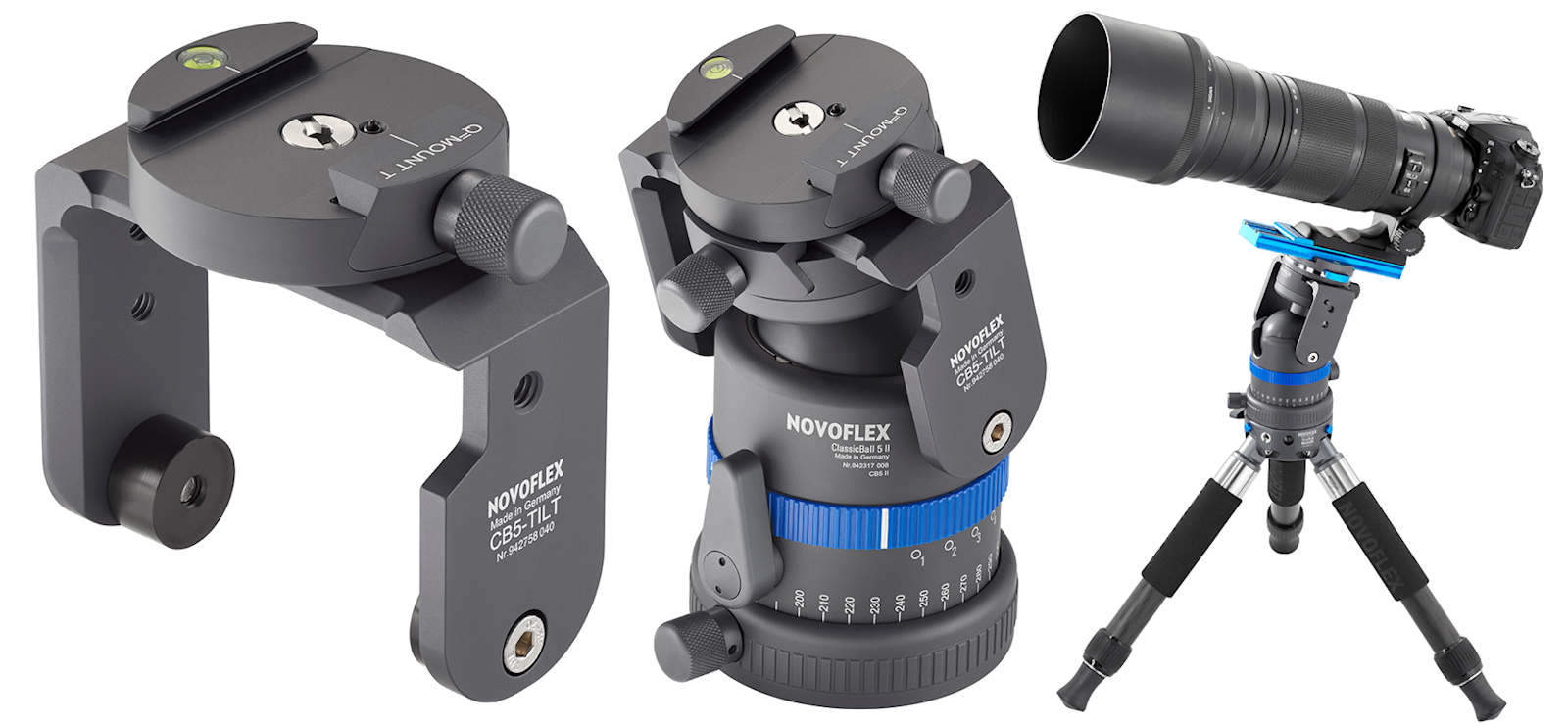 Der CB5 TILT von Novoflex ist eine Systemergänzung für die CB5- bzw CB5 II Kugelköpfe, sowie die Schnellkupplung Q=Base II oder Q=Mount. Mit dem Tiltbügel lässt sich die Längsachse des Kugelkopfs blockieren. So wird bei einem nivellierten Stativ der Horizont stets waagerecht abgebildet, und dynamische Aufnahmen durch horizontales Mitziehen werden vereinfacht.
