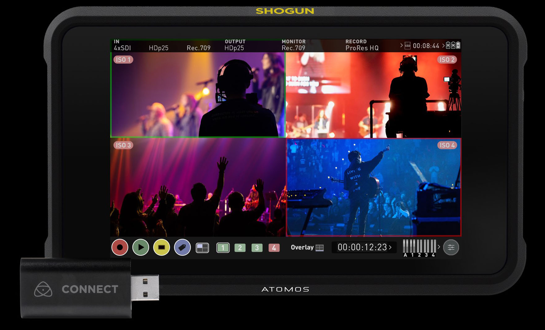 Mit dem Atomos Shogun 7 – einem Monitor-Fieldrecorder-Kombigerät – können Nutzer bis zu vier 1080@60p-Streams gleichzeitig überwachen und aufzeichnen; dann mit einem Tastendruck aufrufen und ausgeben. Dabei können Benutzer günstige Kameras für Multi-Kamera-Produktionen verwenden.