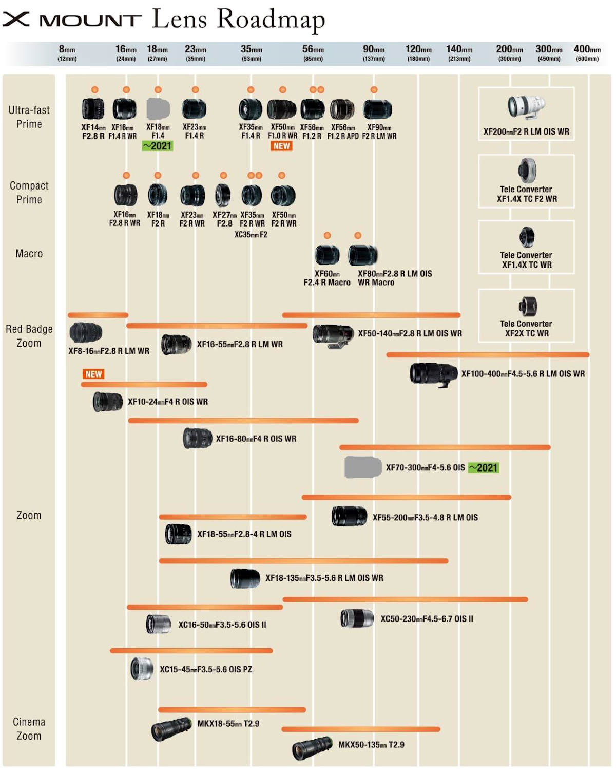 Fujifilm aktualisiert seine Objektiv-Roadmap für die X Serie und kündigt zwei neue Fujinon XF Objektive an. Das aktuelle Sortiment wird um die Festbrennweite XF 1.4/18mm (KB 27mm) und das Telezoom Fujinon XF 4-5.6/70-300mm OIS (KB 105-450mm) erweitert. Inklusive der heute vorgestellten Neuauflage des Ultra-Weitwinkelzooms XF 4/10-24mm R OIS WR (KB 15-36mm), auf welches wir noch separat eingehen, werden dann insgesamt 37 Objektive für die X Serie verfügbar sein.