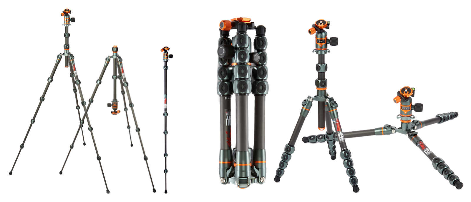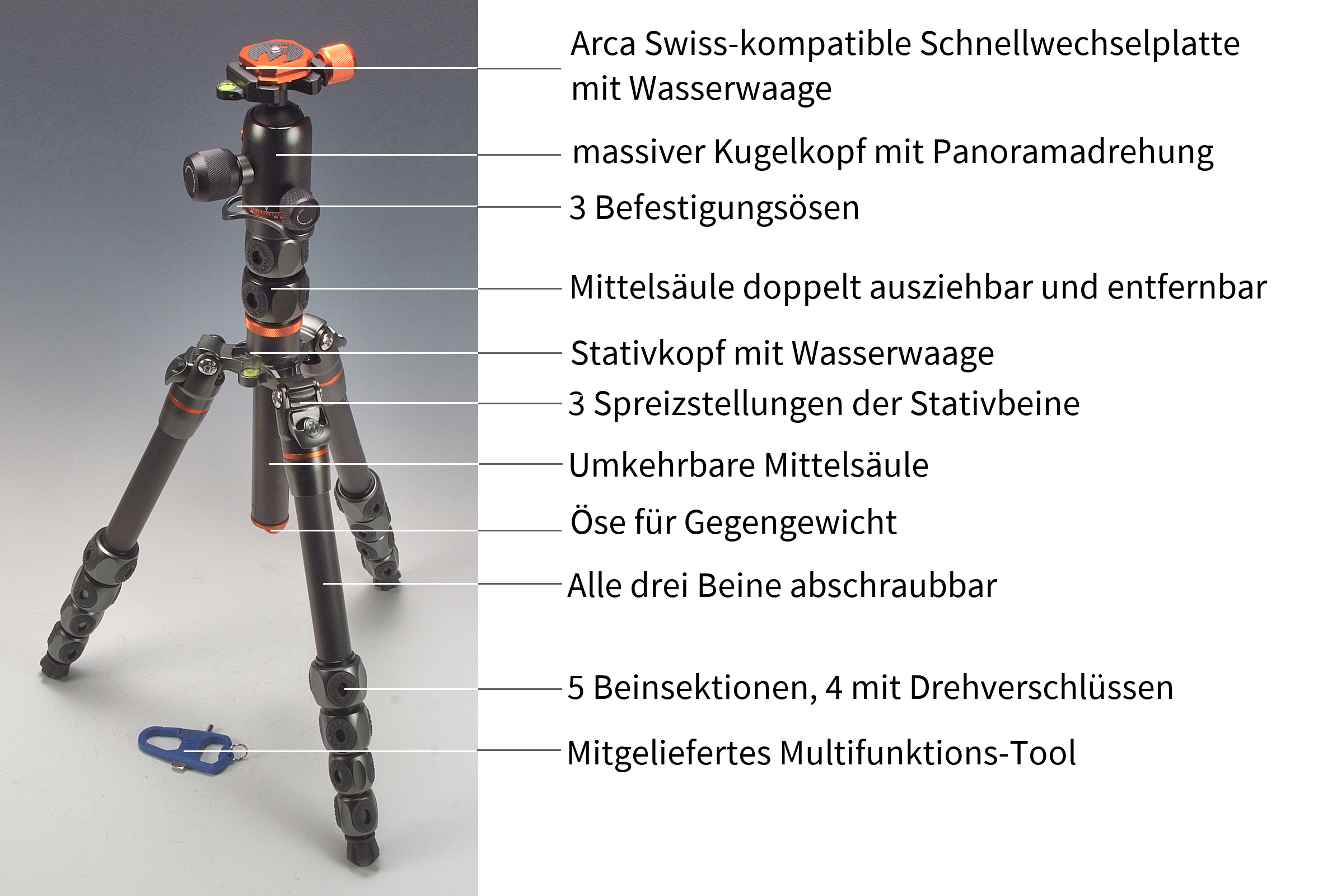 Auffallend an dem Stativ ist die doppelt ausziehbare Mittelsäule, mit welcher das an sich kompakte Stativ mit nur 34 cm Packmass auf eine maximale Höhe von 129 cm kommt. Die Beine lassen sich in den drei Winkeln 23°, 55° und 80° spreizen, was eine minimale Höhe von 10,5 cm ergibt, dies allerdings nur, wenn man die Mittelsäule entfernt und den Kugelkopf direkt auf die Stativschulter montiert. Übrigens lässt sich die Mittelsäule auch von unter her einsetzen, so dass extremste Tiefstellungen mit der Kamera möglich werden. Unten an der Mittelsäule ist eine herausschraubbare Öse angebracht, um das Stativ bei starkem Wind mit einem Gegengewicht zu beschweren, was die Stabilität deutlich verbessert.