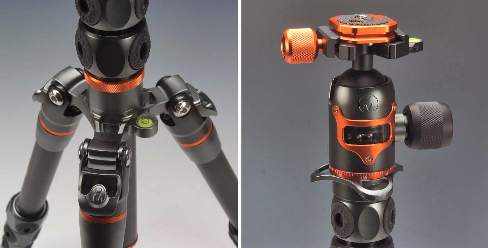 An der Stativschulter ist eine Wasserwaage angebracht, welche das Ausnivellieren des Stativs beim Aufstellen erleichtert. Eine zweite Wasserwaage befindet sich an der Fixierplatte des Kugelkopfes AirHed Vu. Dieser kompakte und leistungsstarke Kugelkopf verfügt über drei Einstellknöpfe, einen für die Kugelfeststellung, einen für die Panoramadrehung und einen dritten für die Fixierung der Schnellwechselplatte. Diese ist Arca Swiss-kompatibel und verfügt auf der Unterseite über zwei herausnehmbare Sicherungsschrauben. Als Besonderheit weist der Kugelkopf eine Sichtöffnung auf, welche einen Einblick in die zentrale Klemmmechanik der Kugel ermöglicht – was mehr Gag als nützlich ist. Unterhalb der Panoramadrehung sind drei Ösen angebracht an welche beispielsweise Karabinerhaken befestigt werden können. Oder man kann bei extremen Windsituationen das Stativ daran mit Seilen und Häringen fest verspannen.