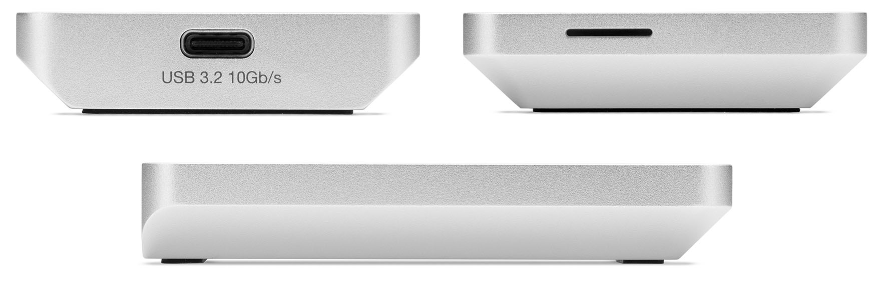 Seitenansichten der Envoy Pro Elektron von OWC mit der USB-C-Buchse auf der Rückseite, die das derzeit schnellste USB unterstützt (USB 3.2 Gen 2), und einer LED auf der Vorderseite, die über den Status des Laufwerks informiert.