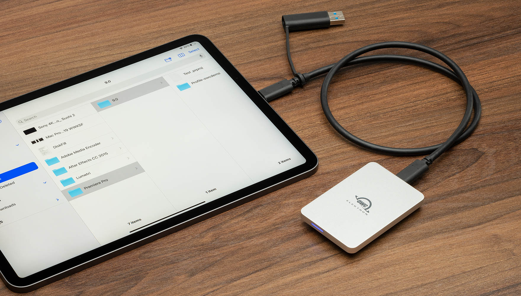 Die OWC-Envoy Pro Elektron an einem iPad Pro