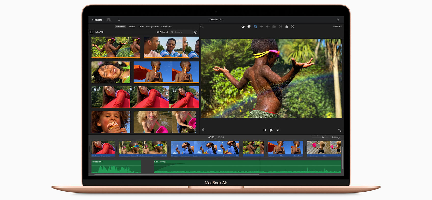 Das iMovie-Videobearbeitungsprogramm auf dem neuen MacBook Air: Mit dem M1 werden Projekte in iMovie noch schneller – und lassen sich bis zu 3-mal schneller exportieren.