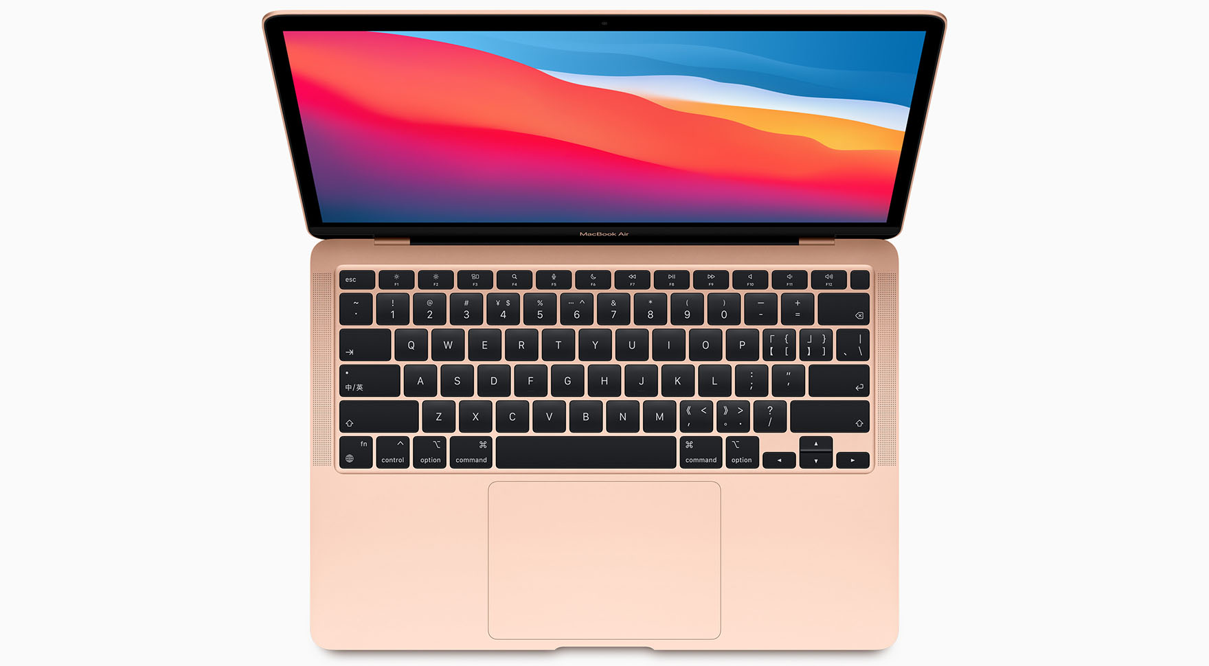 Das neue MacBook Air mit M1 in Gold: Mit dem M1 ist das dünne, leichte Notebook sehr leistungsstark. Es kommt ohne Lüfter aus.