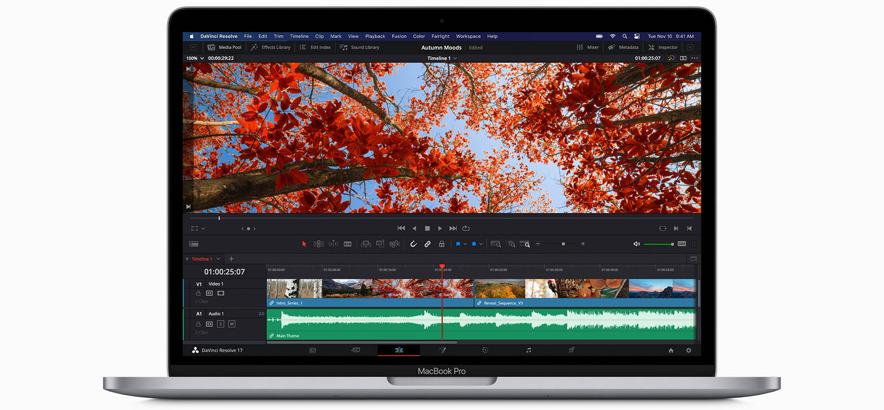 DaVinci Resolve Videosoftware auf dem MacBook Pro 13 Zoll: Das Notebook kann 8K-ProRes-Video in voller Qualität schneiden und wiedergeben, ohne einzelne Bilder zu überspringen.