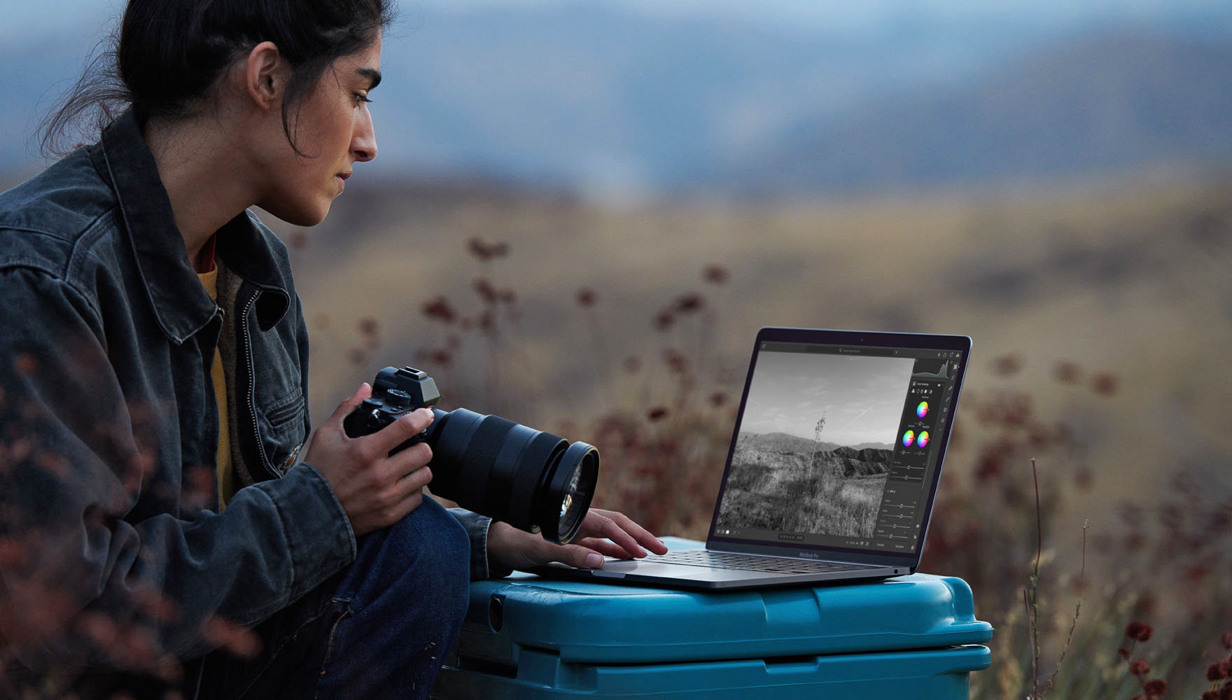 Eine Fotografin verwendet ihre Kamera und das MacBook Air mit M1-Prozessor. Mit dem M1-Prozessor ermöglicht der Mac eine hohe Performance und lange Batterielaufzeit.