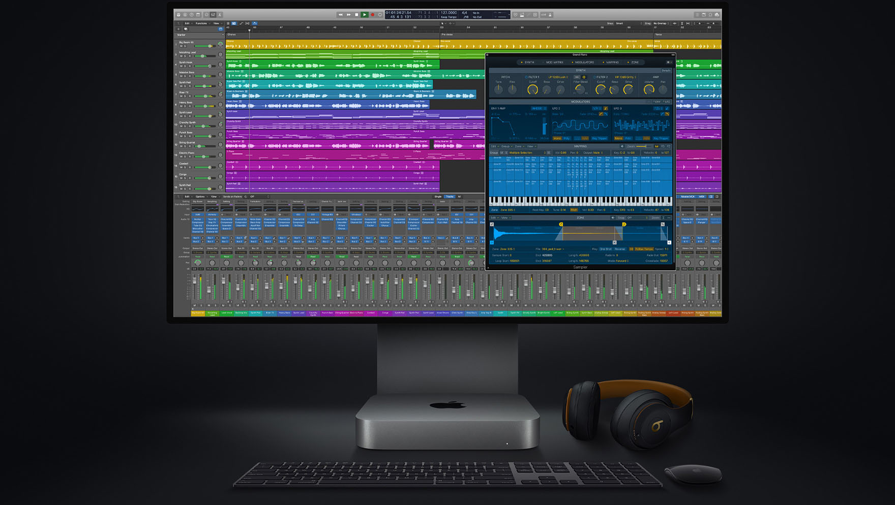 Musikprogramm Logic Pro mit dem neuen Mac mini und Pro Display XDR: Der neue Mac mini ermöglicht Musikproduktion auf einem ganz neuen Level, mit bis zu 3-mal so vielen Echtzeit-Plug-ins in Logic Pro.