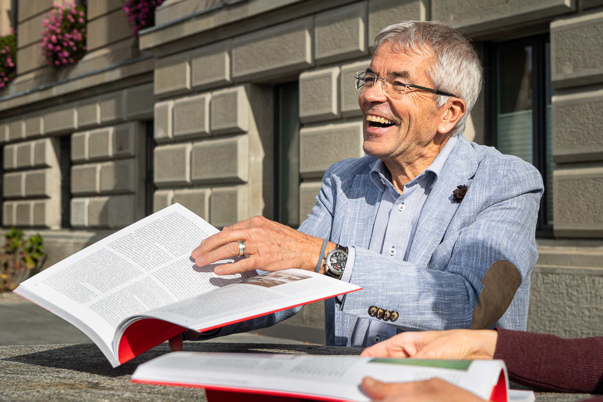 Aufhellblitz bei Sonnenlicht (aus der Reportage «Buchvernissage» Beat Dittli im Freien während der Corona-Zeit)