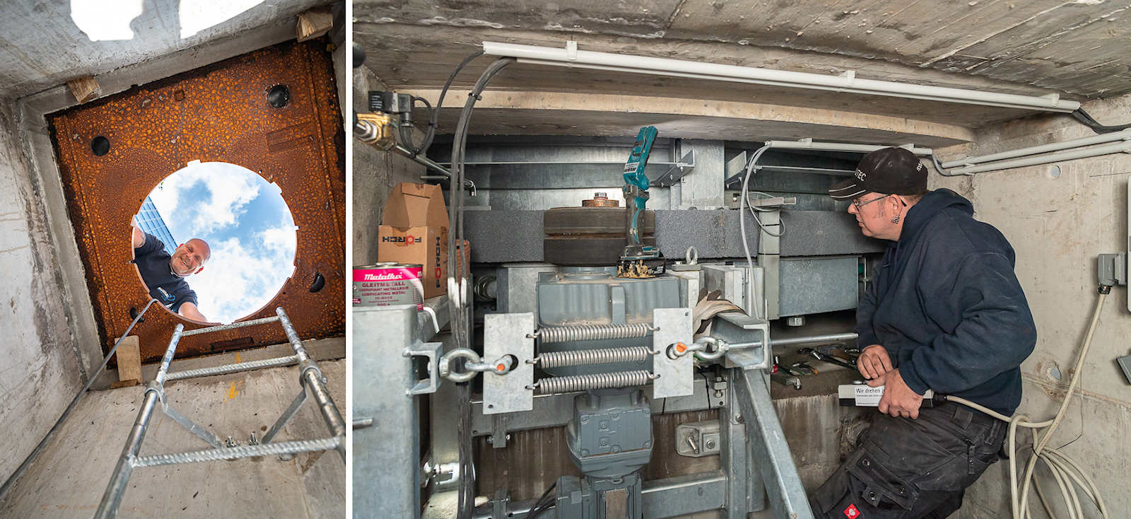 Aufnahme in einem unterirdischen, etwa 4 Kubikmeter grossen Technikraum und nach oben gegen den Himmel fotografiert. Das lichttechnisch schwierige Objekt ist perfekt ausgeleuchtet