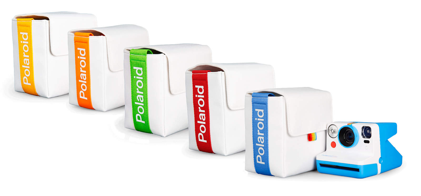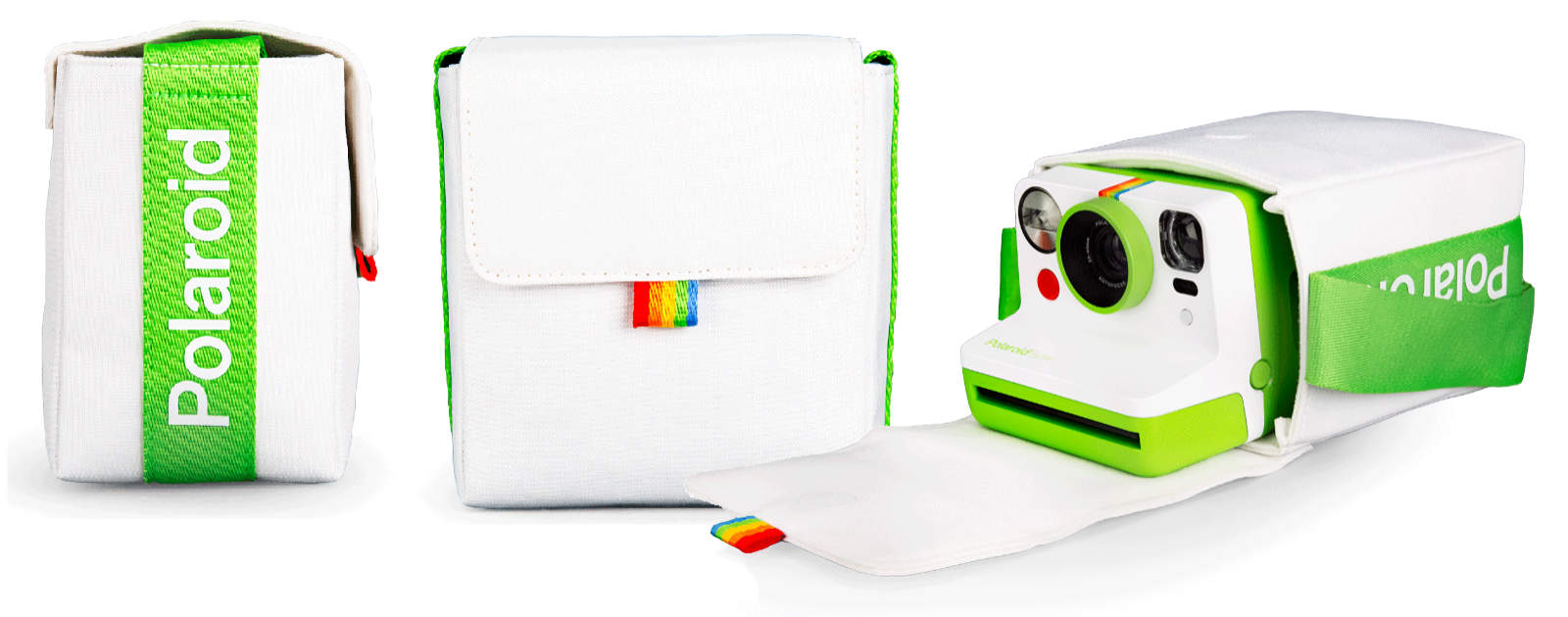 Passend zur Schmuckfarbe der Kamera kommen auch die Taschen mit der entsprechenden Farbnote daher. Die Grundfarbe der Tasche ist, wie die Kamera, Weiss, doch ist der Trageriemen in der passenden Farbe Blau, Rot, Grün, Orange oder Gelb gehalten. Als weiteres Designelement zeigt die Öffnungsschlaufe der Tasche die Logofarben von Polaroid.