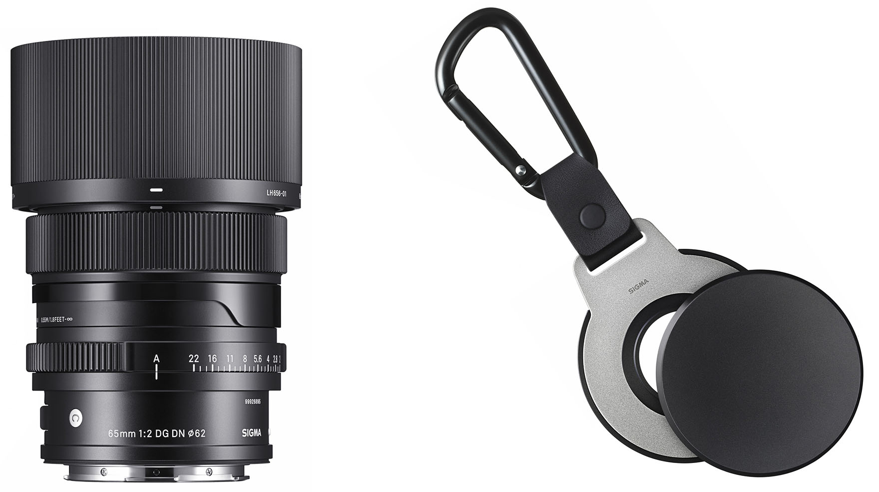 Das neue kurze und doch ordentlich lichtstarke Sigma 2/65mm DG DN | Contemporary in der Variante mit L-Mount und daneben der Halter für Objektivdeckel CH-11, die bei den Objektiven der I-Serie magnetisch halten. Das kurze Tele misst 72 mm (Ø) x 74,7 mm (L), wiegt 405 g und nutzt Filter mit Ø von 62 mm.