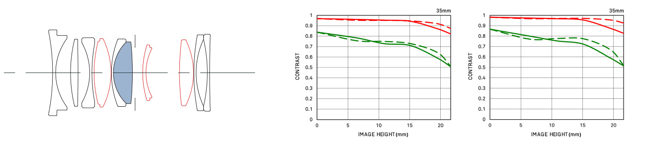 Konstruktion und MTF-Kurven mit Anzeige der Diffraktion (mittleres Bild) und geometrischer Darstellung (ganz rechts) des 2/35mm DG DN | Contemporary