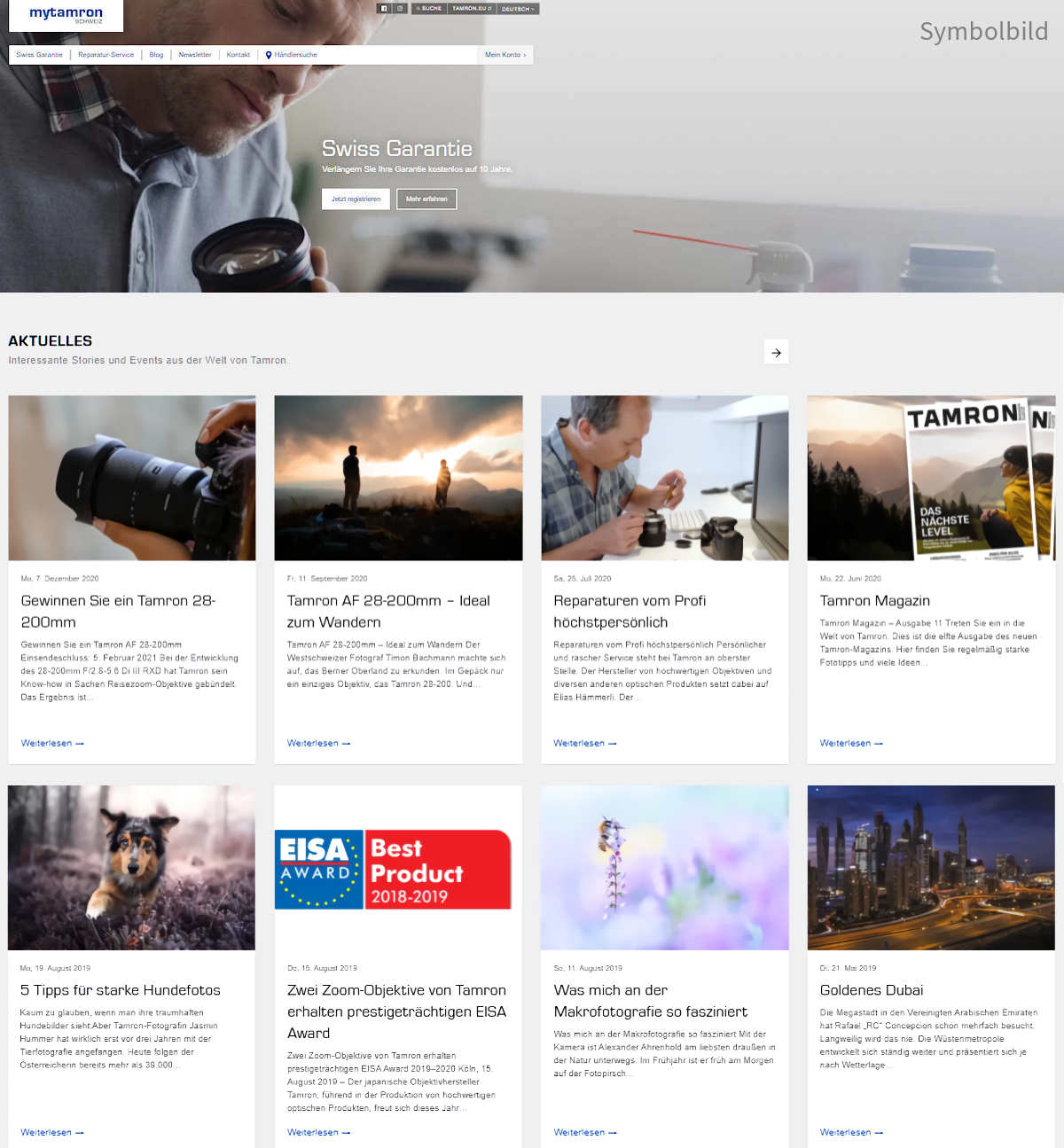Mytamron.ch versteht sich als Dienstleistungs- und Informationsquelle für Besitzer von Tamron-Objektiven in der Schweiz. Die noch im Aufbau befindliche Seite bietet spannende Anwender-Stories, Hintergrundinformationen, Gewinnspiele und vor allem Praxistipps, um die Tamron-Objektive noch vielseitiger und erfolgreicher einsetzen zu können.