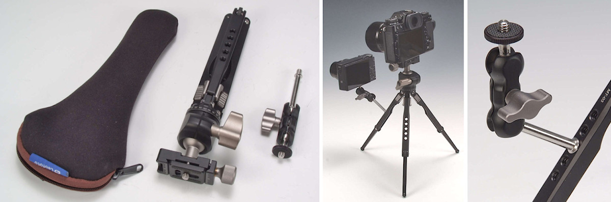 Das MT-03 ist ein Kleinstativ mit 5 bis 6 Kilogramm Tragfähigkeit, höhenverstellbar von 10 bis 25 cm mit einem Gewicht von nur 340 Gramm. Es präsentiert sich als massive Aluminiumkonstruktion mit gehärteter Eloxierung und einer Reihe durchdachter Details, welche Anwendungen ermöglichen, die über das Übliche hinausgehen.