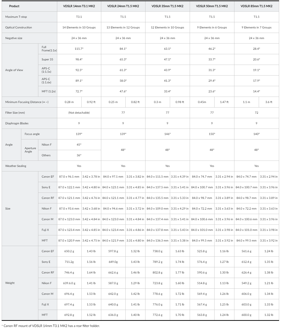 Die VDSLR MK2-Serie von Samyang gibt es in den fünf Brennweiten 14mm, 24mm, 35mm, 50mm und 85mm, als wesentlichste Brennweiten für alle kreativen oder kommerziellen Projekte. Alle fünf Objektive sind voll kompatibel mit sieben DSLR- oder spiegellosen Systemen, die über Canon EF-, Sony E-, Canon RF-, Nikon F-, Canon M-, Fuji X- und MFT-Anschlüsse verfügen. Insbesondere unterstützt dieses 5-Objektiv-Set den neuesten Canon RF-Anschluss, der mit einem rückwärtigen Filterhalter ausgestattet ist.