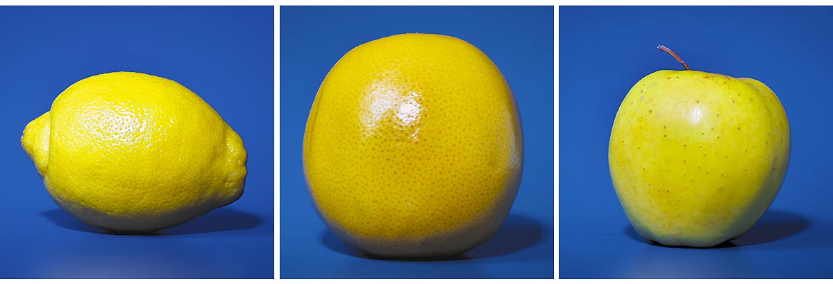 Schauen wir uns noch einmal das Gelb einer Zitrone an. Es ist heller als dasjenige der Grapefruit. Wie aber verhält es sich zum Gelb eines Apfels? Man könnte im ersten Moment glauben, das Gelb der Zitrone sei heller als dasjenige des Apfels. Bei genauem Hinschauen merkt man aber, dass dies nicht korrekt ist. Das Zitronengelb ist nicht unbedingt heller, aber es ist leuchtender, kräftiger als das Gelb des Apfels. Der Farbunterschied liegt weder am Farbton Gelb noch an der Helligkeit, sondern vielmehr an der Farbsättigung. Die Sättigung verändert genauso wie die Helligkeit das Aussehen eines Farbtons und ist damit ein weiteres wichtiges Farbbeschreibungs-Kriterium.
