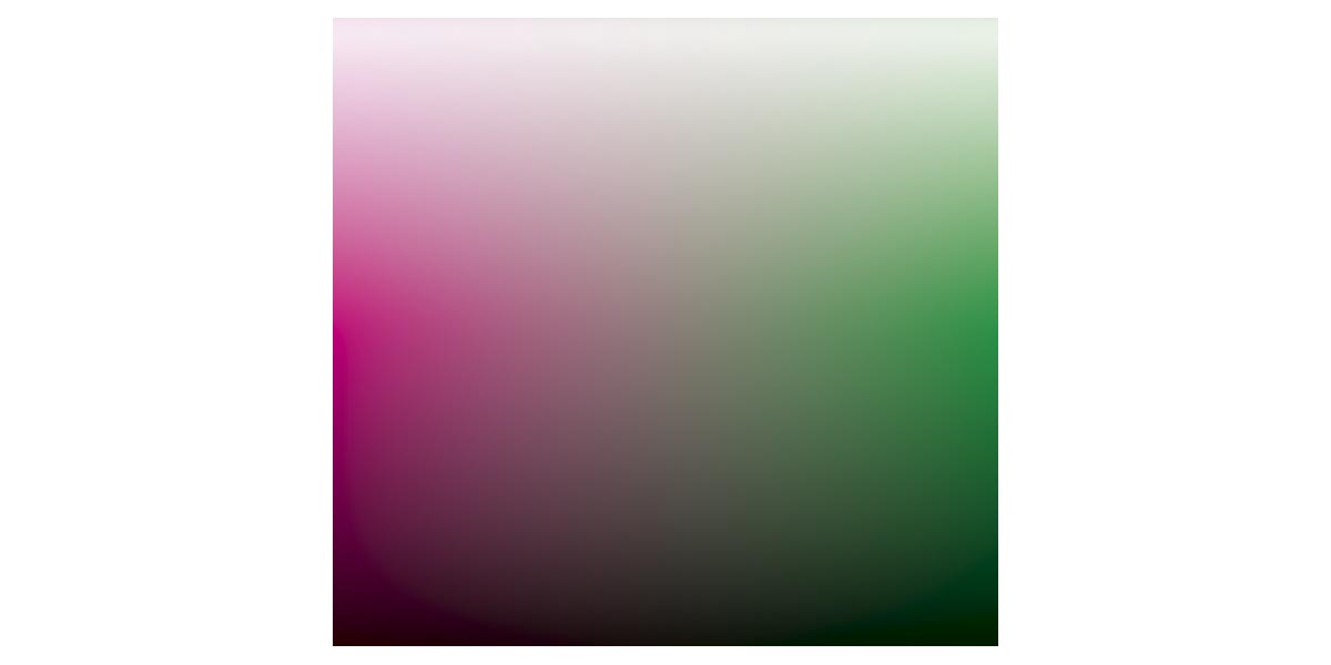 Betrachten wir dazu nachstehende Abbildung, in der von links nach rechts der Farbton stufenlos von Magenta zur Komplementärfarbe Grün verläuft. Von unten nach oben nimmt die Helligkeit zu. Links und rechts in halber Bildhöhe liegen die reinen Farbtöne mit höchster Sättigung. In der Bildmitte ist die Sättigung am geringsten. Beim Übergang beider komplementärer Farben entsteht ein praktisch neutrales Grau.