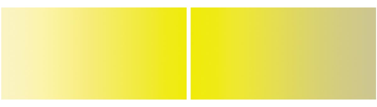 Beide Abbildungen zeigen haargenau denselben, gleichbleibenden (gelben) Farbton. Links: Die Helligkeit verläuft von 40% bis 100%. Rechts: Die Sättigung bei ungefähr identischer Helligkeit nimmt von links nach rechts kontinuierlich ab.