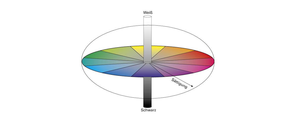Farbton, Helligkeit und Sättigung sind voneinander unabhängige Parameter einer Farbbeschreibung. Erinnern wir dazu nochmals an den zwölfteiligen Farbkreis aus dem Repetitorium 3. Der Farbkreis zeigt ausschliesslich nur die vollgesättigten, reinen Farbtöne. Er kann für die genaue Farbcharakterisierung daher nicht verwendet werden. Wollen wir Farben modellhaft darstellen, so muss eine Form gesucht werden, welche in einer Dimension die Farbtöne darstellt, in einer zweiten die jeweilige Sättigung charakterisiert und in der dritten Dimension schliesslich eine klare Aussage über die Helligkeit macht.