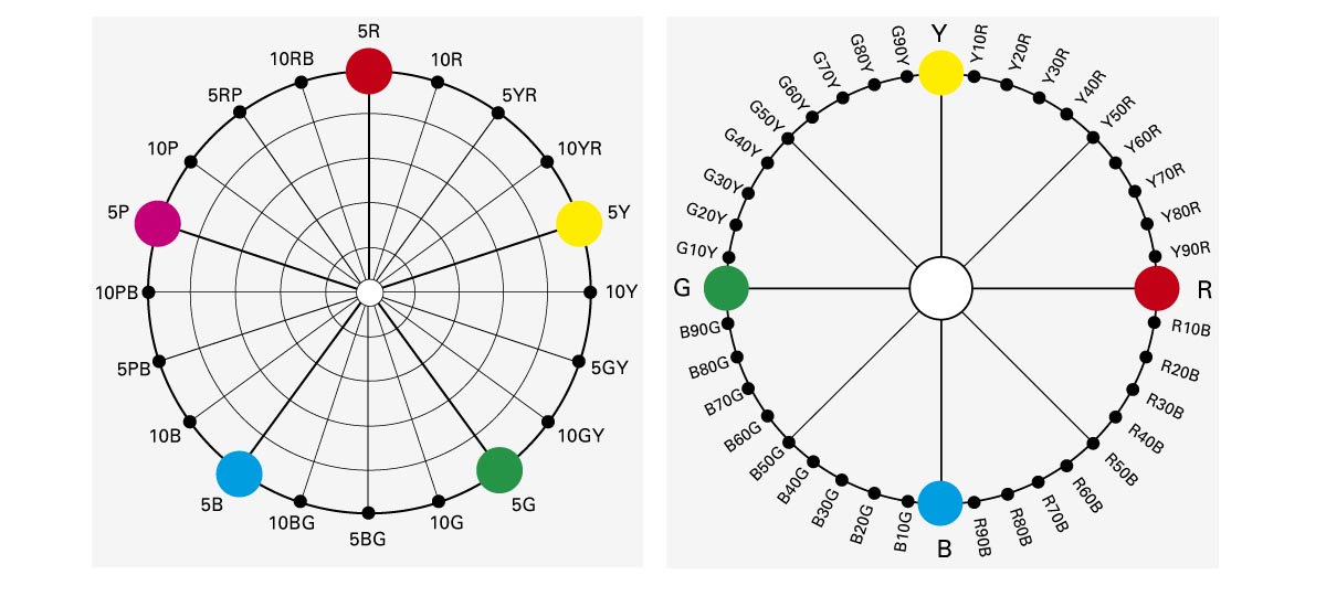 Links: Ältestes Farbordnungssystem von Albert H. Munsell. 1915 herausgegeben und 1943 von OSA verbessert.