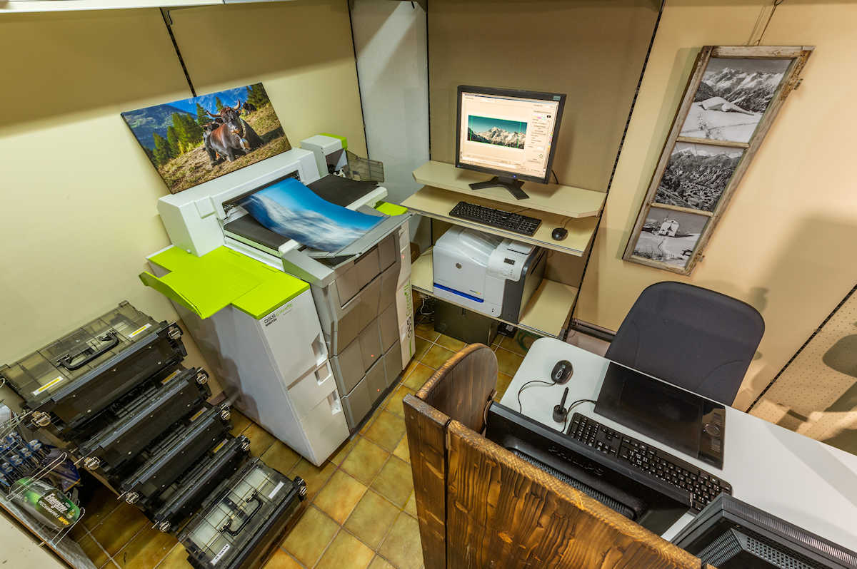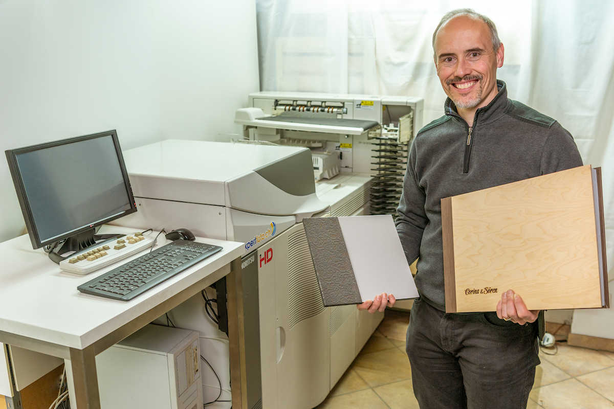 Ja. Mit dem Aufkommen vom Smartphone ist der klassische 10×15 cm Print fast ganz verschwunden. Da wir aber immer noch die Skischulfotografie und die Schulfotografie haben und deshalb unverändert viel printen, haben wir den Maschinenpark nicht redimensioniert. Im Gegenteil, wir haben neue Produkte in unser Angebot genommen. Mit dem Kauf einer manuellen Rillmaschine konnten wir auf einen Schlag in Kombination mit den Noritsu Green ll gefaltete Fotokarten anbieten – und das in unzähligen Varianten. Der Handykunde lässt bei uns nicht unbedingt viele Prints machen, sondern er sucht eher etwas Spezielles zur Präsentation seiner Bilder, zum Beispiel ein Leinwand- oder Dibondbild, ein Fotogeschenk, eine Fotokarte oder dann eben ein Fotobuch, das er selber gestalten kann oder wir übernehmen die Gestaltung für ihn.