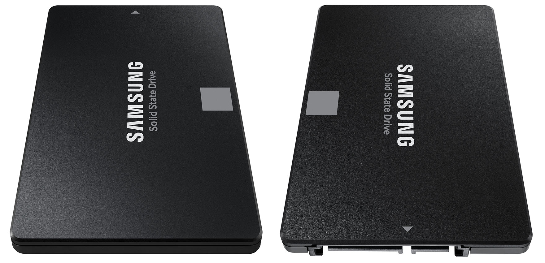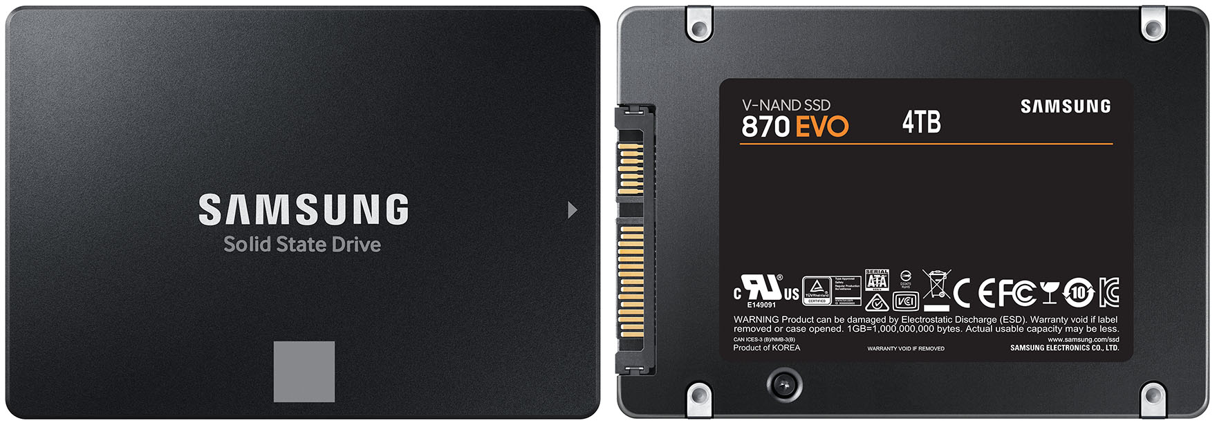Vorder- und Rückseite der Samsung 870 EVO: Die SSD im 2,5-Zoll-Fomat und mit SATA-Schnittstelle dürfte gerade mit ihren grossen Kapazitäten bis 4 TB für Fotografen und Filmer attraktiv sein.