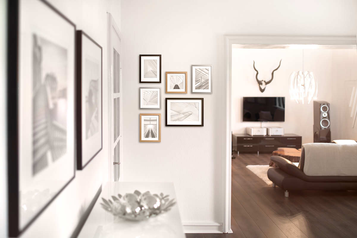 Kleinere Formate können wirkungsvoll in verschiedenen Rahmen in einem bestimmten Raster gehängt werden.