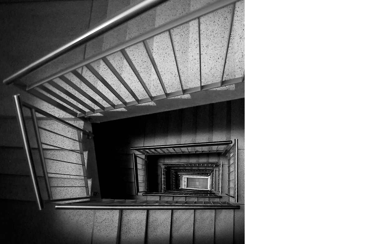 Linien und Flächen. Diese Aufnahme eines Treppenhauses zeigt sehr schön, wie mit Linien und Flächen ein Bild gestaltet wird und wie so eine starke Tiefenwirkung entsteht. (24 mm | f/2,8 | 1/30 | ISO 400 © Regula Seiler)