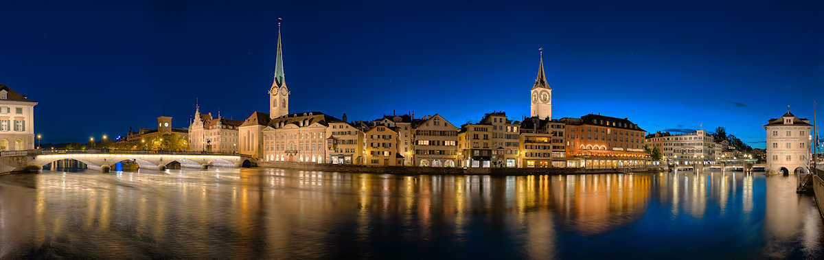 Panoramaformat. Ungewöhnliche Formate (wie bei dieser Panoramaaufnahme von Zürich in der Blauen Stunde), üben eine besondere Faszination auf uns aus. Dieses Bild wurde aus einer Belichtungsserie von 6 x 7 Aufnahmen zusammengefügt. (27 mm | f/7,1 | 1/3 – 20 s | ISO 200 © Daniel Rohr)