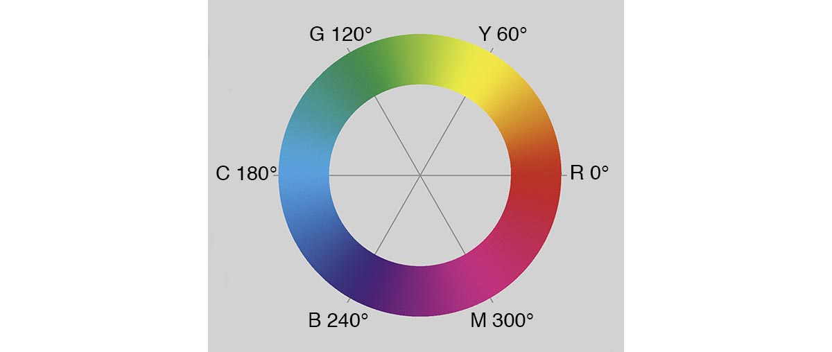 Der Farbton wird in Form eines Farbtonwinkels auf dem Farbkreis festgelegt und als Winkel zwischen 0° und 360° definiert. […] Im Abstand von jeweils 60° liegen die reinen Primär- und Sekundärfarben Rot, Yellow, Grün, Cyan, Blau und Magenta.“