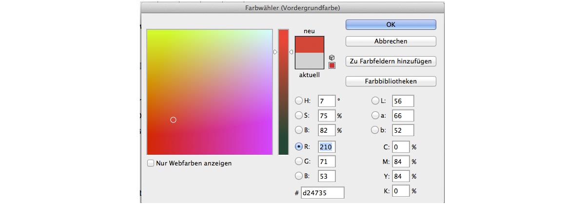 Im Farbwähler von Photoshop können Farben wahlweise im RGB-, CMYK, LAB- und HSB-Modus definiert werden.