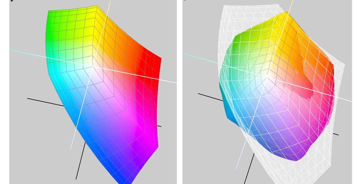 Farbraumvergleich Links: Dreidimensionale Darstellung des sRGB-Farbraums, in welchem die meisten Bilder von Digitalkameras geliefert werden. Rechts: Dreidimensionale Darstellung des Vierfarben-Druckfarbraums PSO coated v.3 mit hell überlagertem sRGB-Farbraum. Dieser CMYK-Druck-Farbraum ist insgesamt kleiner als der sRGB-Farbraum, überragt ihn jedoch in einzelnen Farbbereichen (in dieser Ansicht im Blaubereich, in gedrehter 3-D-Ansichten auch im Grün- und Gelbbereich). All jene Farben von sRGB, welche ausserhalb des Farbbereichs von PSO coated liegen, sind zwar auf dem Bildschirm sichtbar, können dagegen nicht korrekt gedruckt werden.