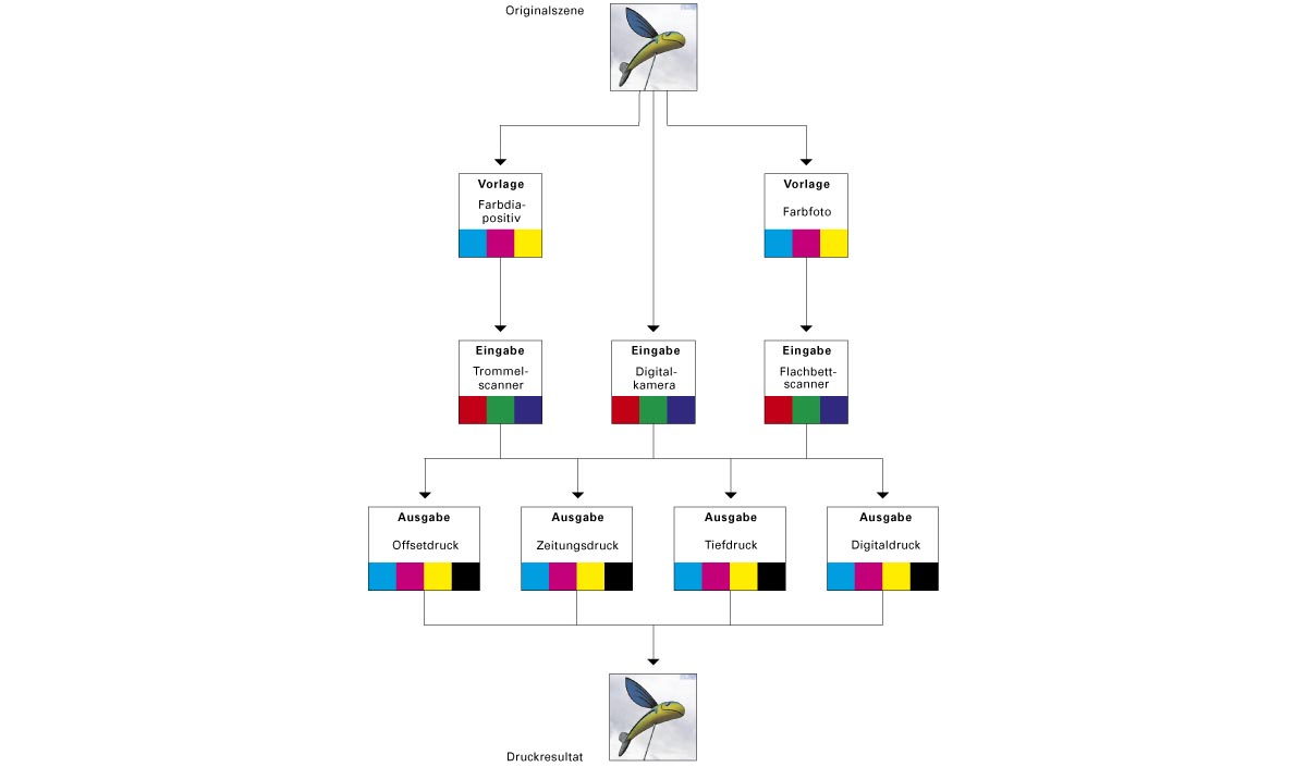 Jedes in der digitalen Bildverarbeitung eingesetzte Ein- und Ausgabesystem (Digitalkamera, Scanner, Monitor und Drucker bzw. Drucksystem) hat einen eigenen, geräteabhängigen Farbraum. Geräteabhängig bedeutet, dass die zahlenmässige Beschreibung einer Farbe noch keine Auskunft darüber gibt, wie diese Farbe auf einem Ausgabesystem wirklich aussieht. Im CMYK-Farbraum beispielsweise werden lediglich die prozentualen Anteile von Cyan, Magenta, Yellow und Schwarz definiert. Die zusätzlichen Einflussgrössen auf die Farbbildung im Druck wie die spektrale Eigenschaft und die Sättigung der Druckfarben, die Färbung des zu bedruckenden Stoffs und die Tonwertabweichungen beim Druckprozess sind nicht definiert. Dies bedeutet, dass bei absolut gleichen CMYK-Werten – je nach Drucksystem – sehr unterschiedliche Farben entstehen.