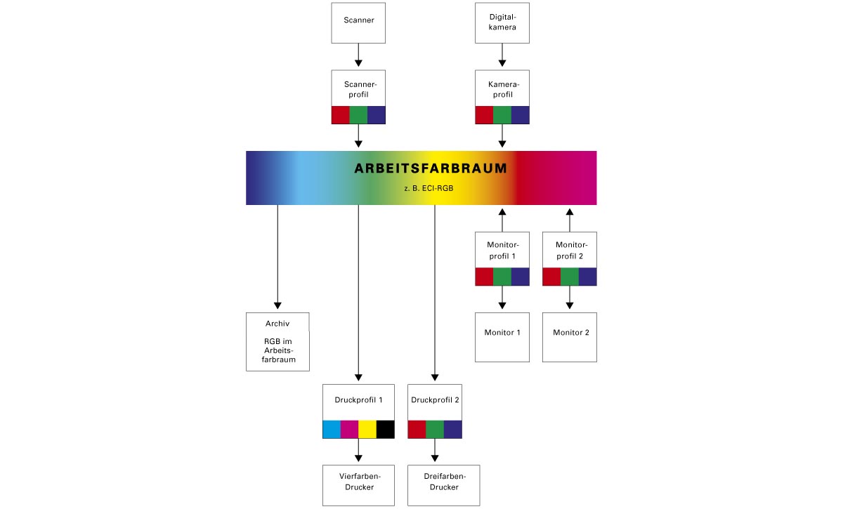 Der RGB-Arbeitsfarbraum, in dem die Bilddaten bearbeitet werden, beschreibt dadurch nicht mehr den Monitor, sondern einen – je nach Aufgabe – geräteunabhängigen Farbraum. Weil dieser Farbraum unabhängig vom Monitor genau und immer gleichbleibend definierbar ist, lassen sich ihm für die Umrechnung absolut exakte LAB-Werte zuordnen. Bei gleicher Separationseinstellung entsteht somit – unabhängig vom Monitor und dessen Profil – absolut identisch separierte CMYK-Daten.